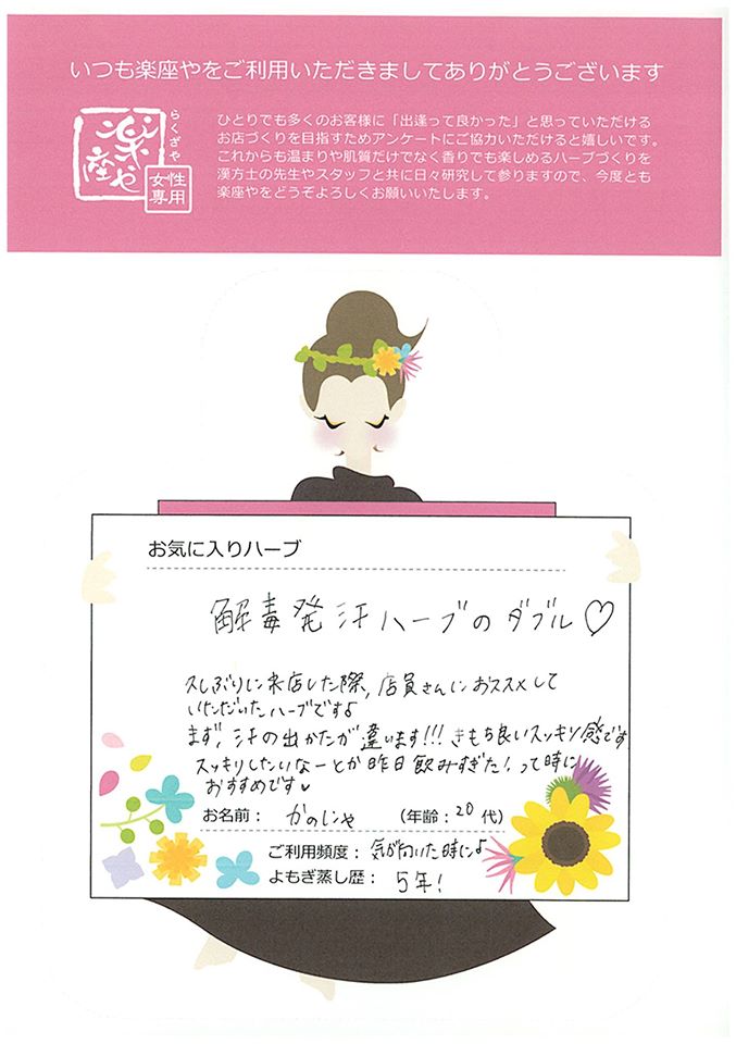 お名前:【お客様の声】「汗の出かたが…」(かのにゃ様20代よもぎ蒸し歴5年)